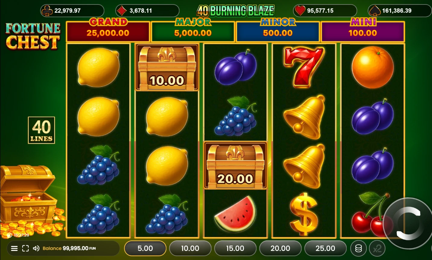 Crank up the heat with Pascal Gaming's explosive newcomer: 40 Burning Blaze 6 Reels Fortune Chest! This fiery 6-reel powerhouse blazes a trail in our brand-new Fortune Chest category, fusing classic slot nostalgia with the irresistible Hold and Win mechanic for heart-pounding thrills across 40 sizzling paylines.