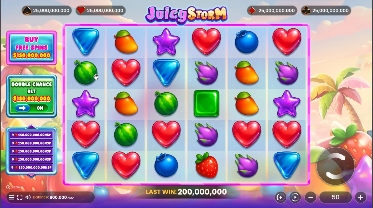 Dive into the electrifying world of Juicy Storm, a 6x5 Buy Bonus slot by Pascal Gaming that redefines excitement with its Pay Anywhere system. Wins spark when 8 or more matching symbols land anywhere on the grid, triggering the Tumble/Cascading Reels feature for thrilling chain-reaction victories. The game’s vibrant visuals and dynamic animations immerse players in a storm of juicy rewards.